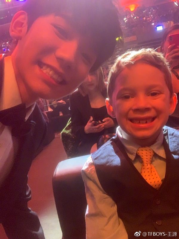 王源白衬衫、黑领结的纯黑色西装造型让人觉得他就是那个骑白马的小王子,正统的西装在他身上没有丝毫的老气,与“假笑男孩”的自拍合影说明了青春气息真不是穿上了西装就能关得住的。