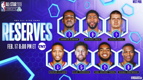 威斯布鲁克(雷霆,第8次入选)、安东尼·戴维斯(鹈鹕,第6次入选)、约基奇(掘金,首次入选)、利拉德(开拓者,第4次入选)、汤普森(勇士,第5次入选)、阿尔德里奇(马刺,第7次入选)、唐斯(森林狼,第2次入选)