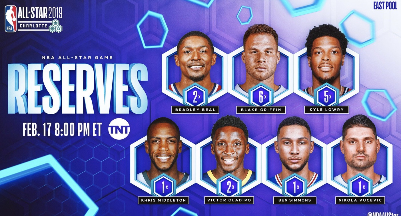 奥拉迪波(步行者,第2次入选)、格里芬(活塞,第6次入选)、米德尔顿(雄鹿,首次入选)、洛瑞(猛龙,第5次入选)、本·西蒙斯(76人,首次入选)、比尔(奇才,第2次入选)、武切维奇(魔术,首次入选)