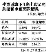 公投结果宣布当天,李嘉诚旗下主要上市公司股价暴跌:长江基建跌5.477%,长和跌5.074%,电能实业跌4.762%,长实地产跌去3.21%,跌幅均高于当日恒指跌幅(2.920%)。上述四家公司一天之内市值分别缩水107.35亿港元、179.5亿港元、74.7亿港元和59.6亿港元,合计蒸发市值421亿港元。