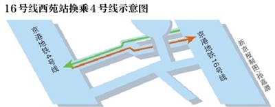 在16号线西苑站南侧约120米处,是已经开通运营的4号线西苑站。16号线与4号线在西苑站“牵手”,两线通过两条约6米宽、120米长的Y字形通道在站厅层实现换乘,宽敞且位于同层的换乘通道将为乘客节省很多时间,从该站换乘4号线只需3分钟。