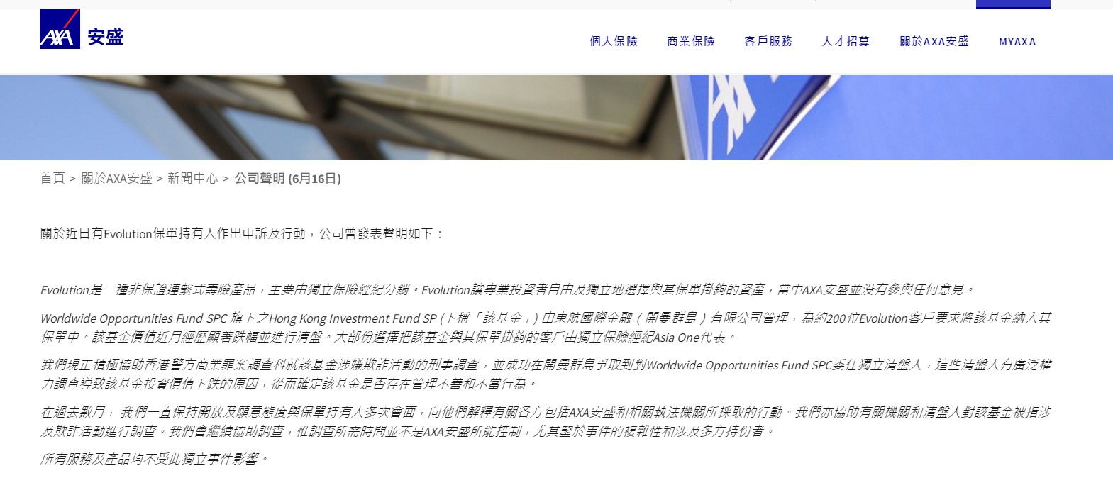 针对上述保险产品净值暴跌,安盛公司分别在今年5月16日、6月10日及6月16日发布声明,其多次强调,Evolution是一种非保证连系式寿险产品,主要由独立保险经纪分销。Evolution让专业投资者自由及独立地选择与其保单挂钩的资产,当中安盛并没有参与任何意见。