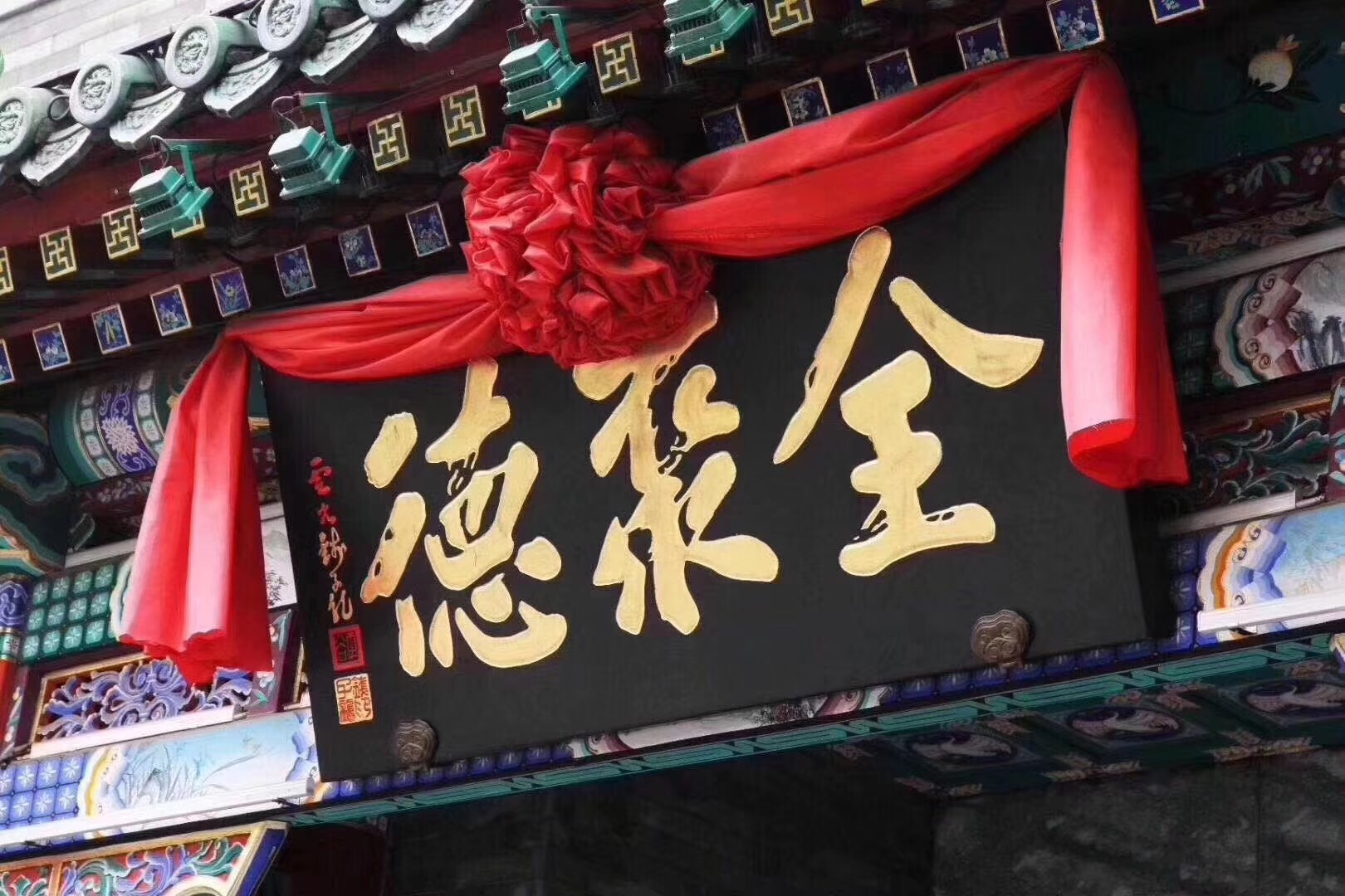 前门全聚德起源店还有一件见证历史的“镇店之宝”,那就是老门面墙。这个老门面始建于清光绪二十七年,长9.3米、高3.8米、厚0.3米,三开间,门楣为砖砌拱券结构,两侧是槛墙支摘窗。门窗上方均有砖雕匾额,正中为“全聚德”,左为“老炉铺”,右为“鸡鸭店”,展现了清末民初时期前门大街老字号商户的店铺特色。