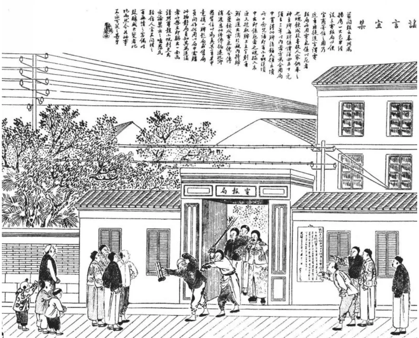 出自《点石斋画报》,泰州新设电报局,但民间谣传,电报所用电气是用死者之魂魄炼成,于是有人便将祖宗神牌拿去,想以四十五元的价格出售给电报局。