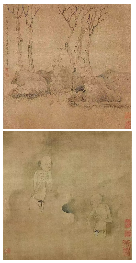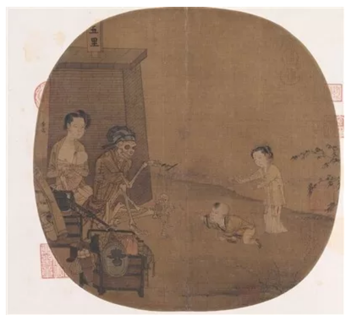 南宋画家李嵩的《骷髅幻戏图》,装扮成货郎的骷髅鬼正用一个小傀儡骷髅吸引小孩儿爬过来,寓意着无所不在的死亡给活人带来的陷阱。所谓的鬼就是死亡的代表,对鬼的恐惧也就是对死亡的恐惧。