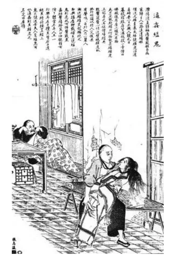 《点石斋画报》中对鬼的描述,包含了鬼的三种不同形态:与活人一般无二的鬼、瘦骨嶙峋披头散发的奇鬼,以及突然变身的缢鬼。图为“与活人一般无二的鬼”。