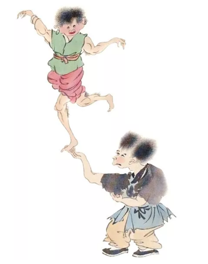溥儒笔下的鬼趣图,玩杂耍的两只小鬼儿,如果不是尖嘴猴腮和乱蓬蓬的头发,几乎与普通的顽皮儿童别无二致。