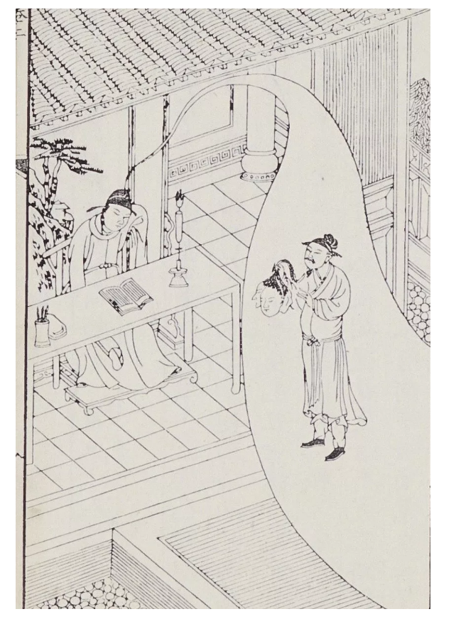 明代正统十年乙丑科状元商辂,在考试之前梦见一个人提着三颗头颅。一般人或许会将其当成恐怖噩梦,但事实上,它却预兆吉祥,头即“首”,又被称为“元”,提着三颗头,是“连中三元”之意。插图出自万历刻本《状元图考》。