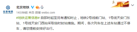 即时起北京地铁前门站、天安门东站、天安门西站临时封站