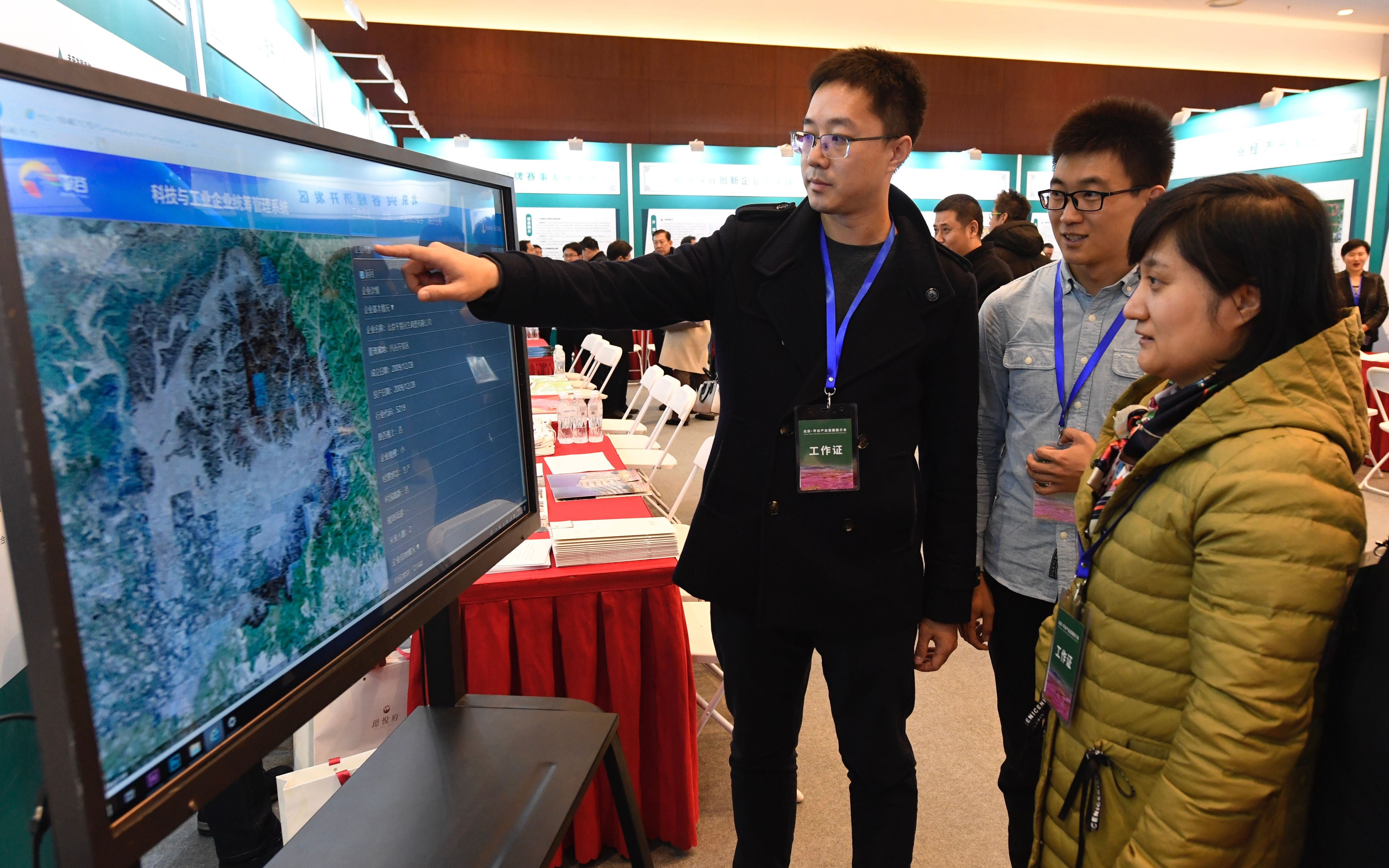 推介会上,平谷区科学技术和工业信息化局设置了大屏幕,观众可以在屏幕上可以查到平谷区的工业企业地理位置、详细的生产经营信息及全区商办楼宇资源信息。摄影/新京报记者 吴宁