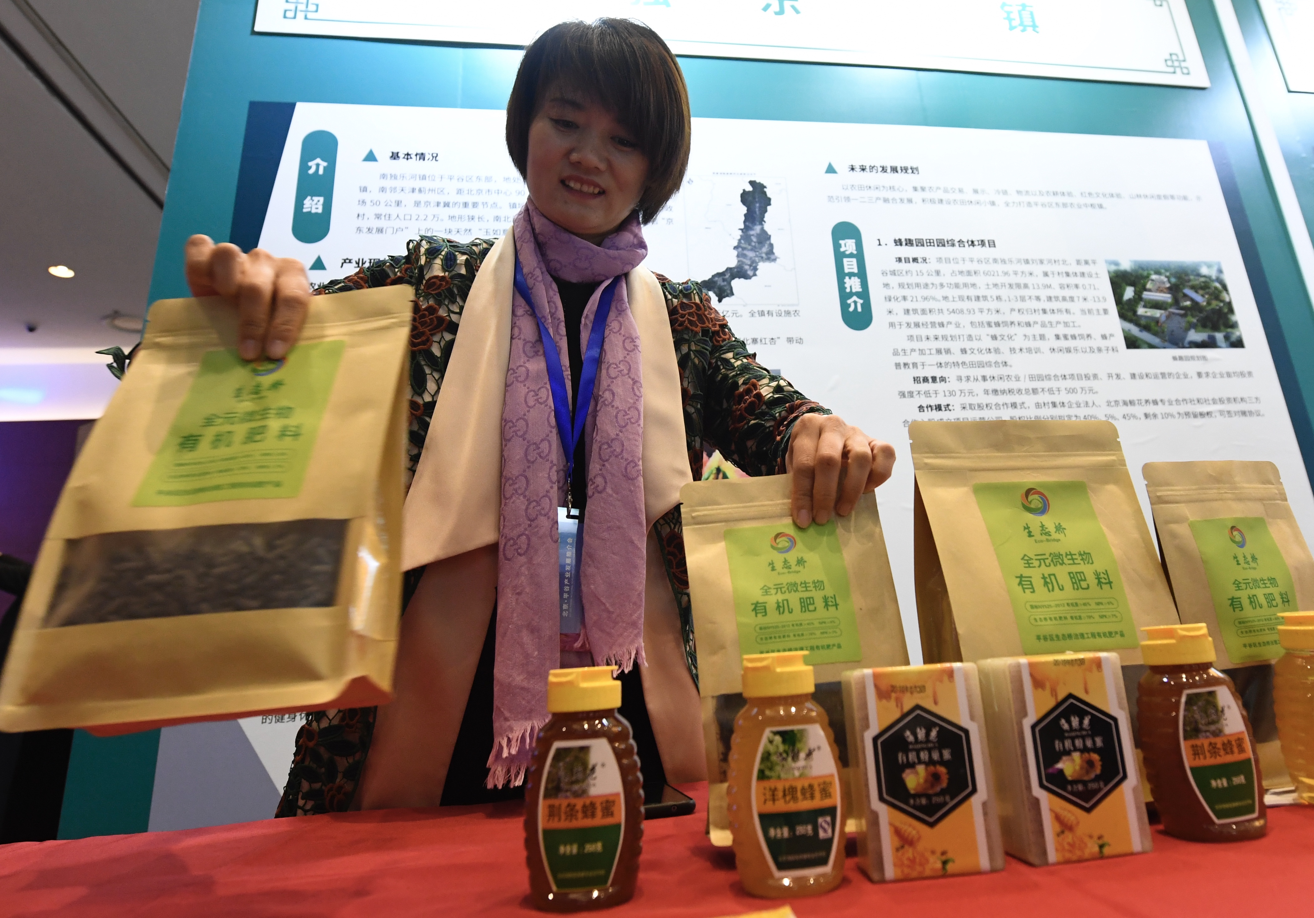 工作人员展示南独乐河镇蜂趣园田园综合项目和生态桥有机肥料。摄影/新京报记者 吴宁
