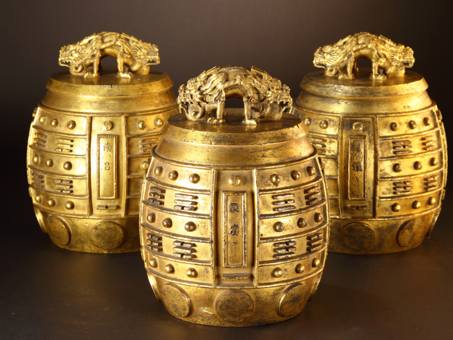 清康熙五十四年御制铜鎏金蒲牢钮八卦纹“南吕”编钟。古董板块拍品。