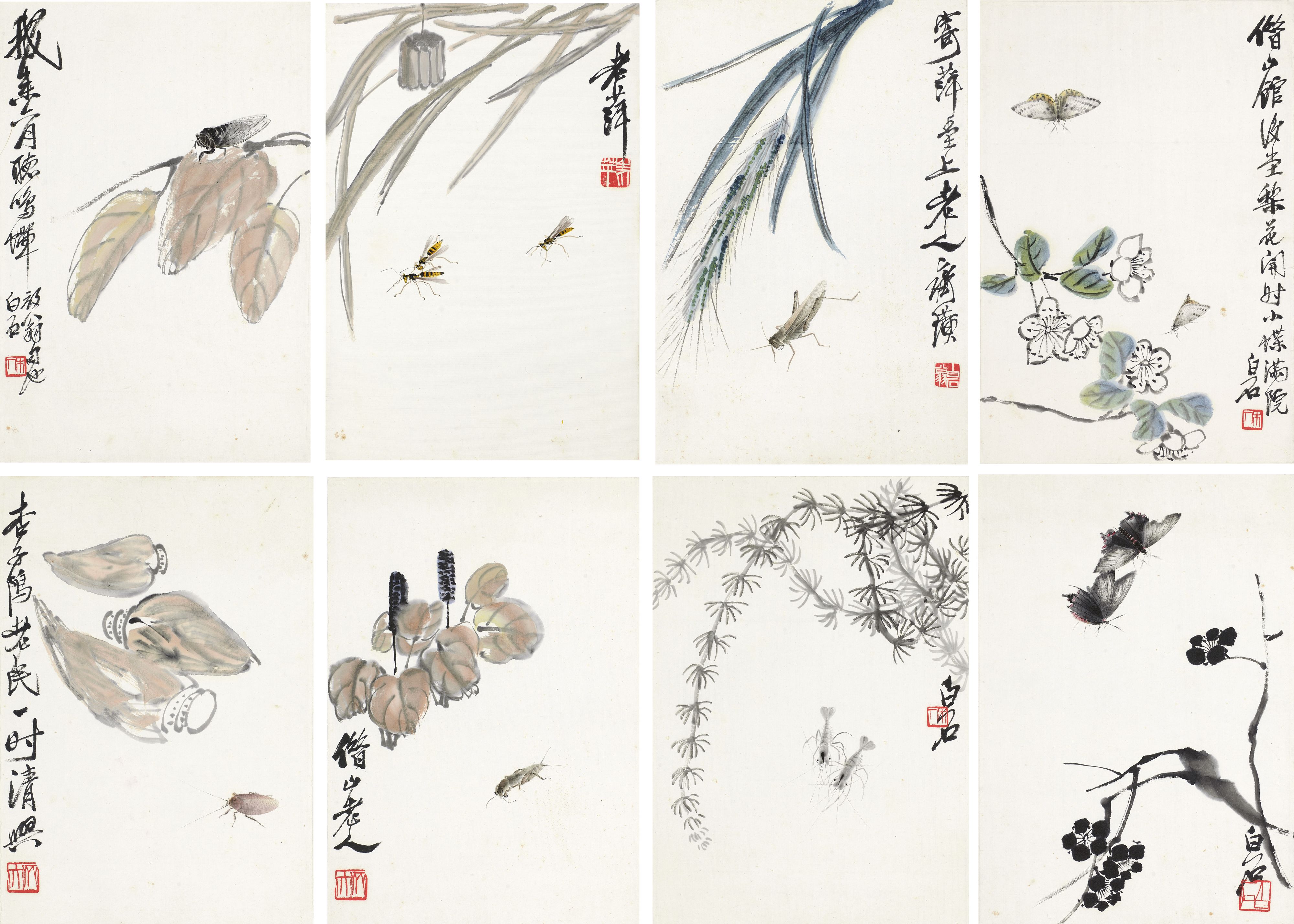 齐白石《花卉工笔草虫册八开》。中国书画板块拍品。