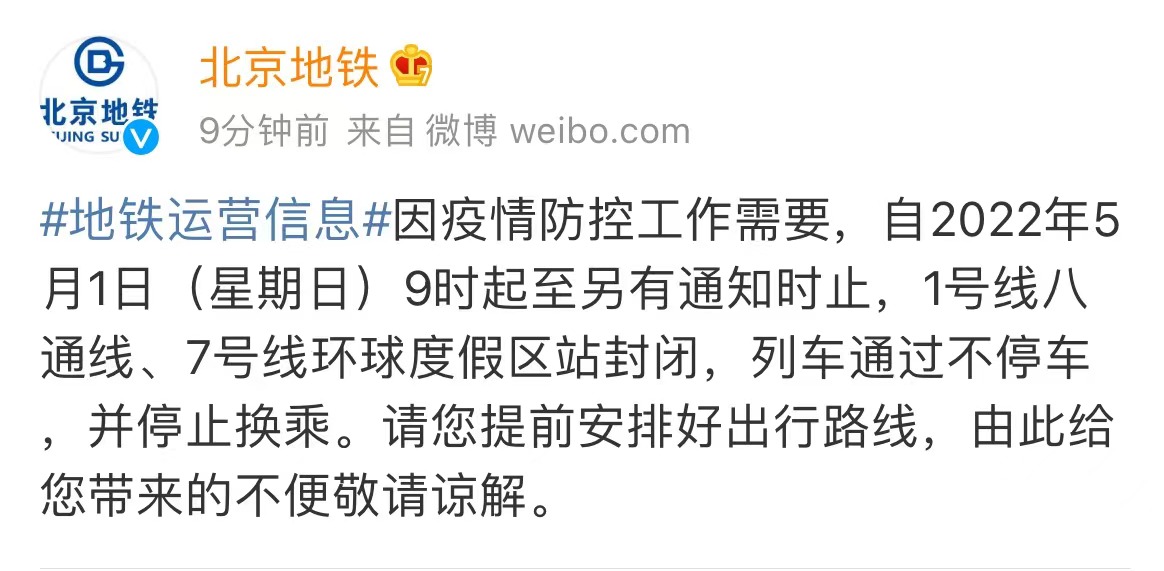5月1日9时起北京1号线八通线、7号线环球度假区站封闭