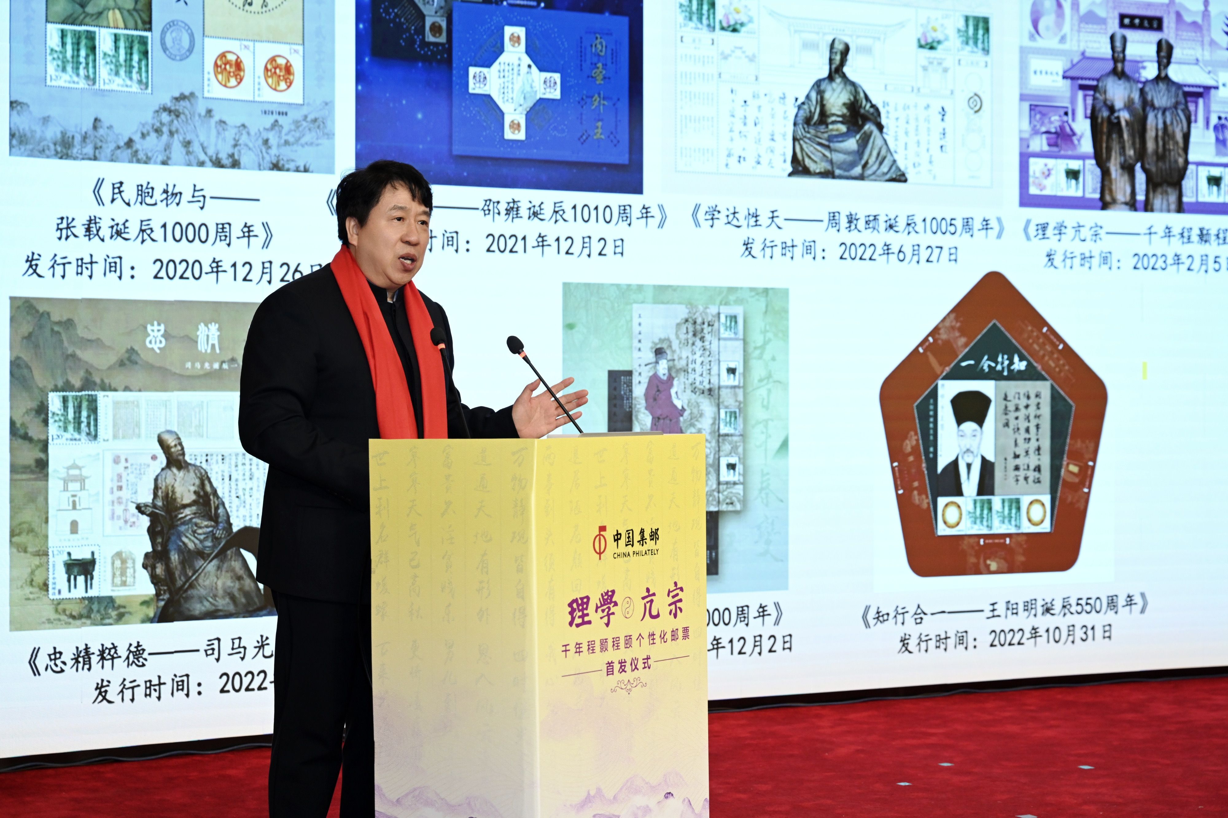 此外,此次发行的《理学亢宗——千年程颢程颐》双主图绢质个性化邮票采用丝绢材质、特殊编码,作为首版紫色基调邮票,顺理得时。先贤系列个性化邮票的总策划、集邮文化学者任永信在活动中深入为广大集邮爱好者解读了邮票发行思路和诸多亮点。他首先强调北宋是中国文化的高地,是展现中国形象的重要窗口,发行先贤系列个票旨在弘扬文化、传承文脉、展现底蕴。他用“兄弟重逢、五子登科、七星高照、八仙过海”概括了自2020年以来先贤系列个性化邮票的总体思路,并重点解读千年程颢程颐邮票:特色纷呈,巧思场景,名家匠心,营造出“紫气中来”的顺理吉祥;紫外灯下呈现中国国家图书馆宋版儒经《二程集》明代刻本以及更多二程名句;双主图《诚信》和《花卉》“梅花”契合先贤风骨,丝绢材质古色古香,特殊号段妙趣横生。方寸之间映照程颢程颐先贤之风,以邮为媒传承文脉讲好中国故事,展现可信可爱可敬的中国形象。最后,任永信为广大集邮爱好者介绍了拟将发行的书画系列个性化邮票规划。