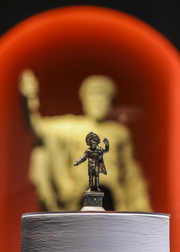 公元1世纪青铜《赫丘利小雕像》。此次展览分为三个主题单元:“美的承继” “生活之美”“美的演绎”,通过近70组雕塑、壁画、青铜器、玻璃器、马赛克等古罗马时期遗珍,展现古罗马人对“美”的追求。
