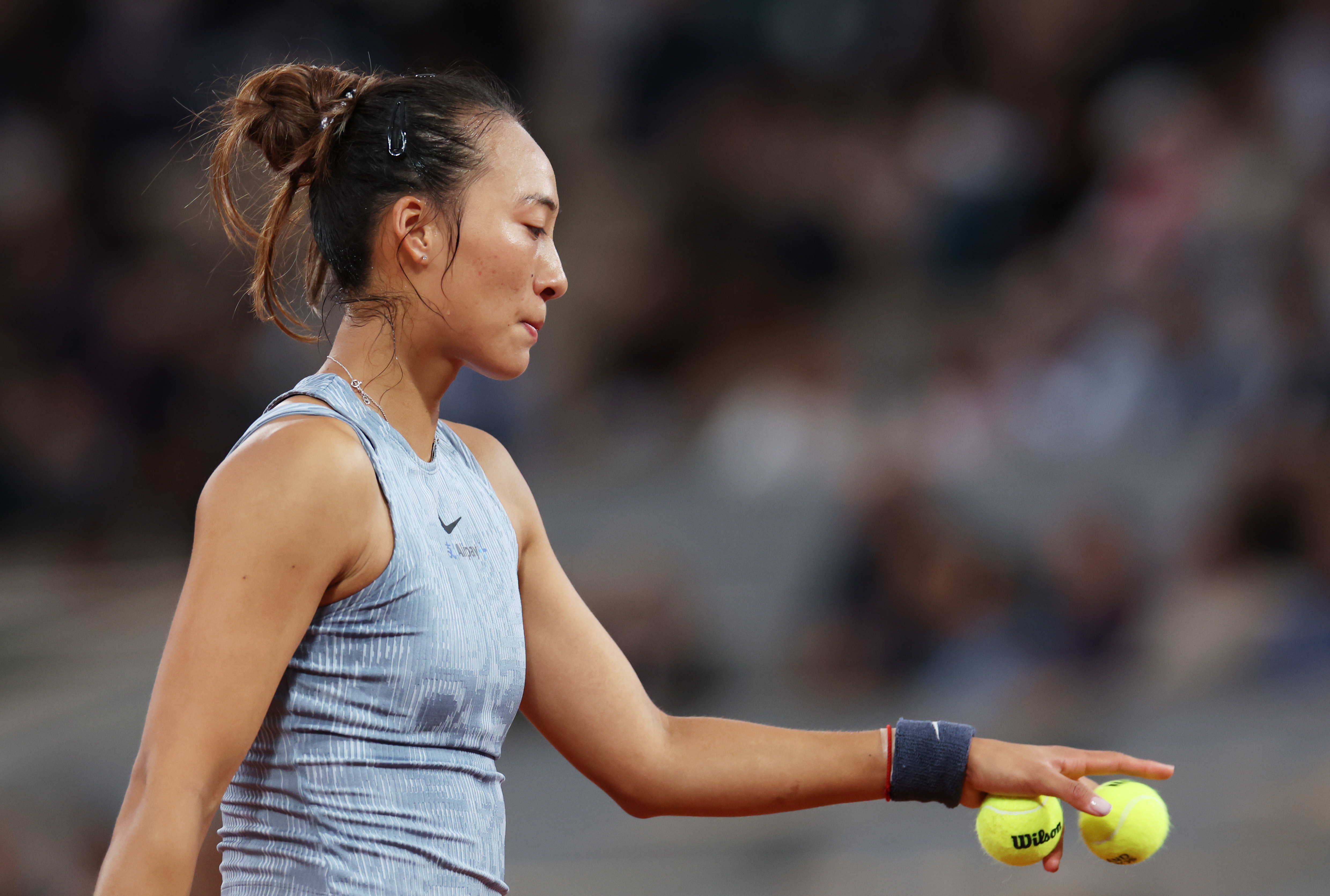 郑钦文在比赛中准备发球。图/新华社