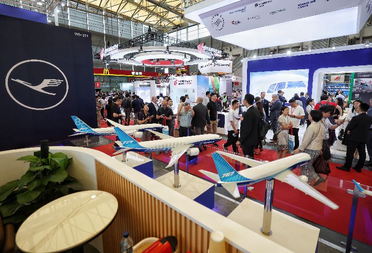 6月25至27日,第十九届中国国际物流节暨第二十一届中国国际运输与物流博览会&2024亚洲物流双年展在上海新国际博览中心举办。本届物流节吸引700余家业内优质展商参展,集中展示了业内发展最新成果和经营成就。图为观众参观货机飞机模型。