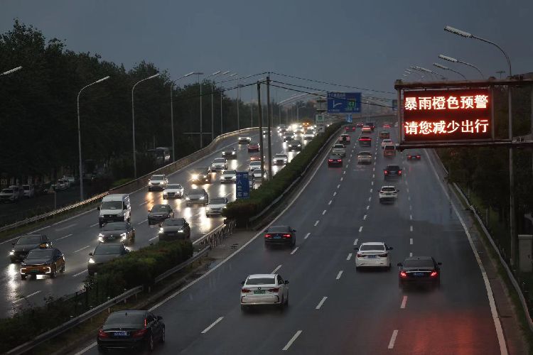 7月24日18时许,南四环主路,电子显示屏提示“暴雨橙色预警”。