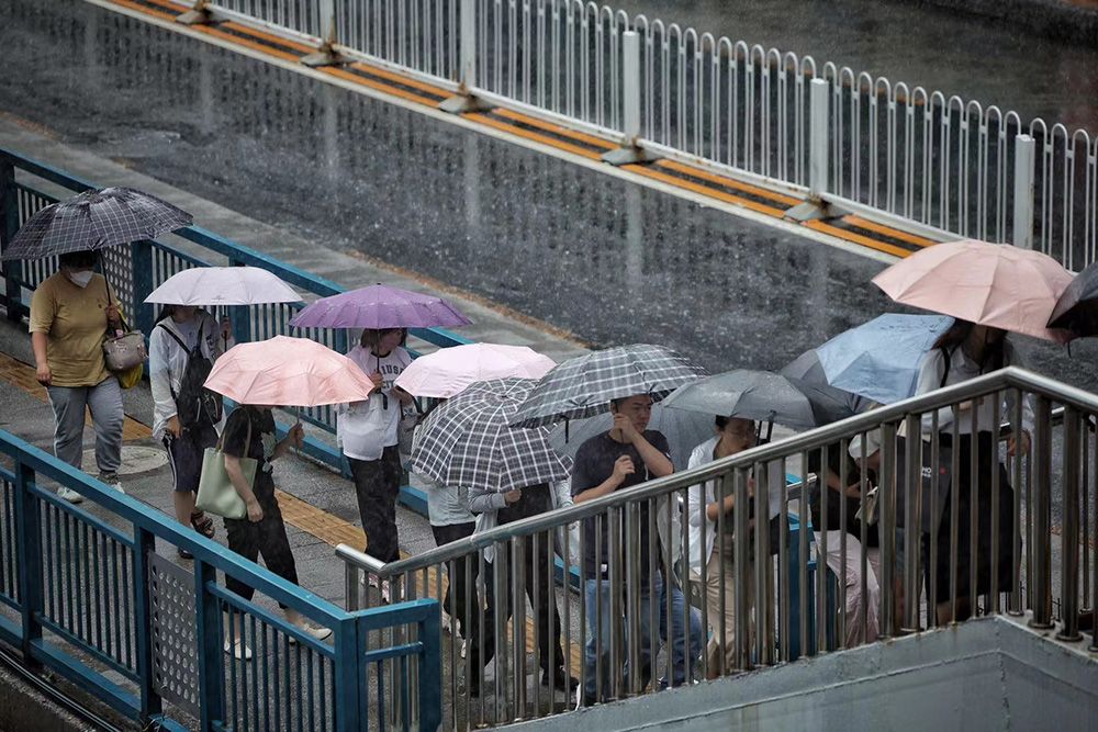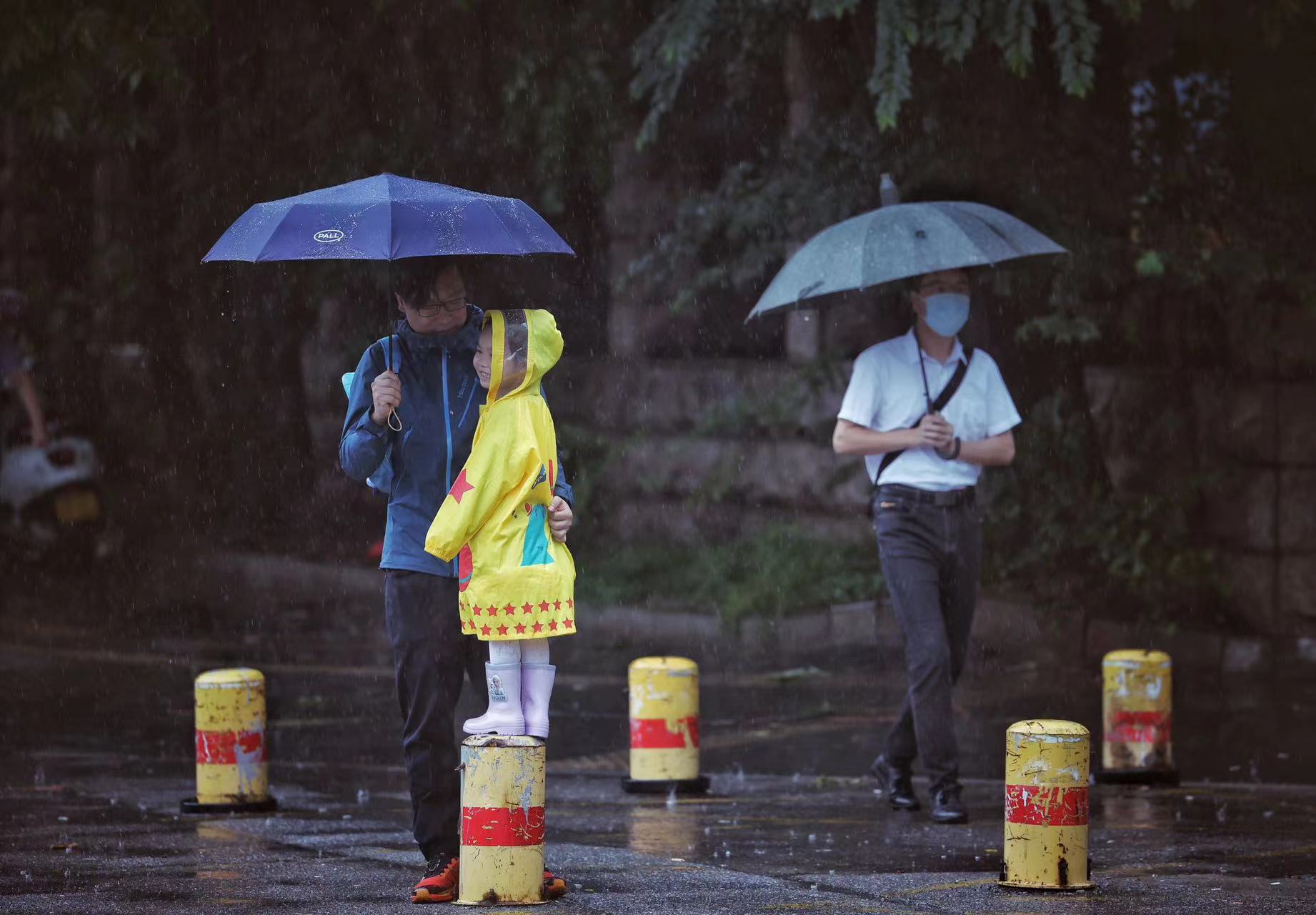 慈云寺东路,家长打着伞与孩子站在雨中。
