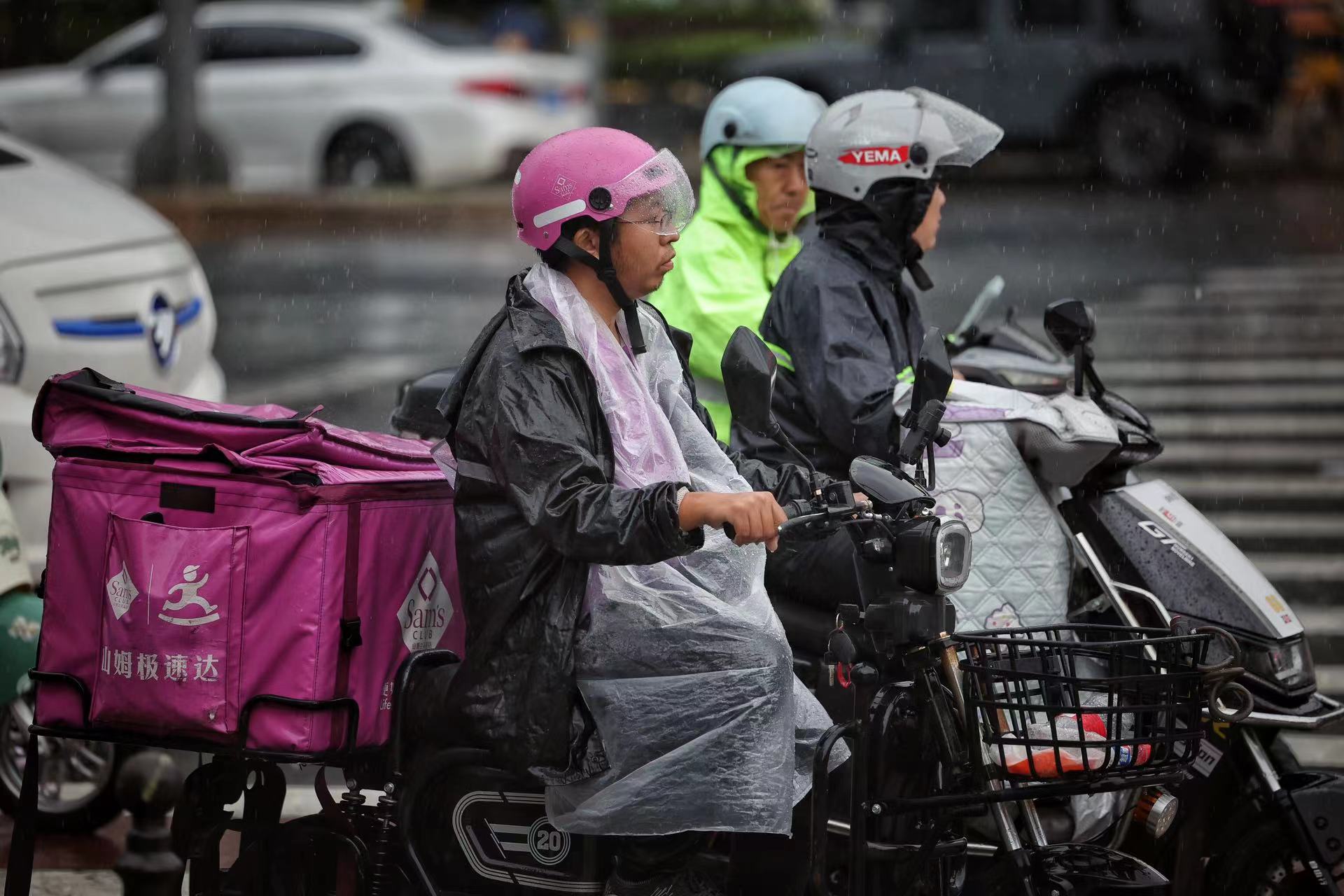 朝阳路,配送员雨中送货。