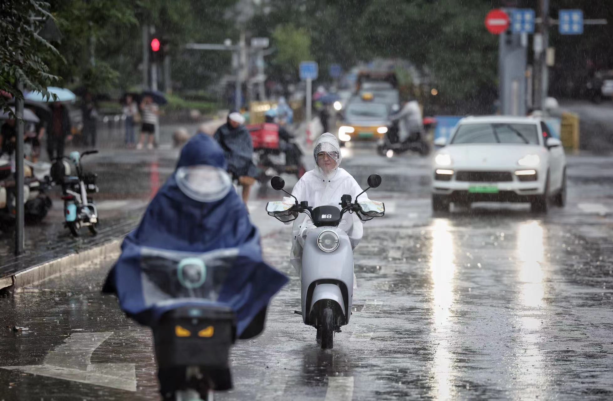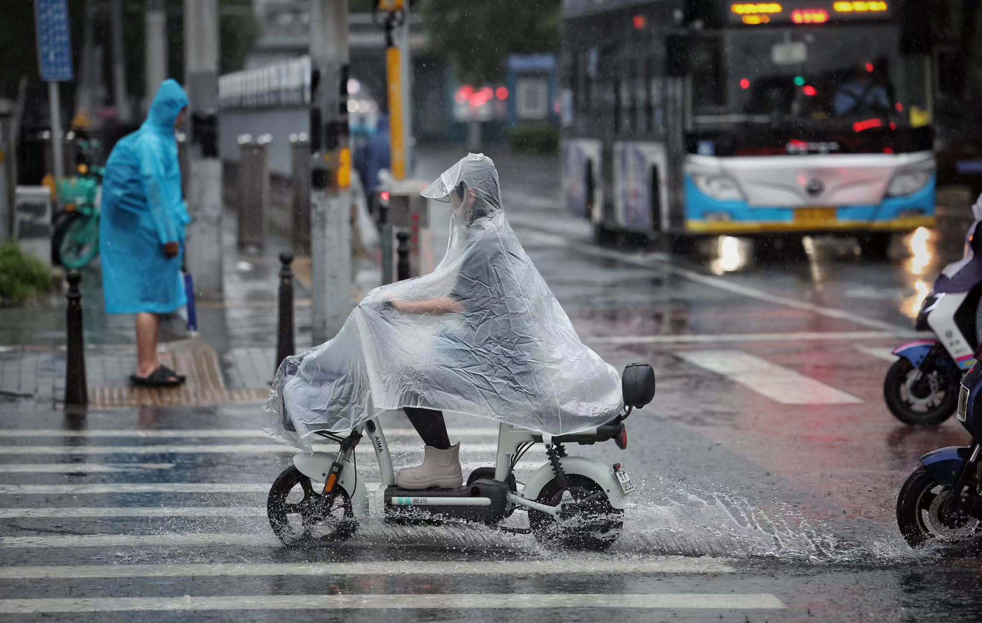 慈云寺东路,市民在雨中骑行。