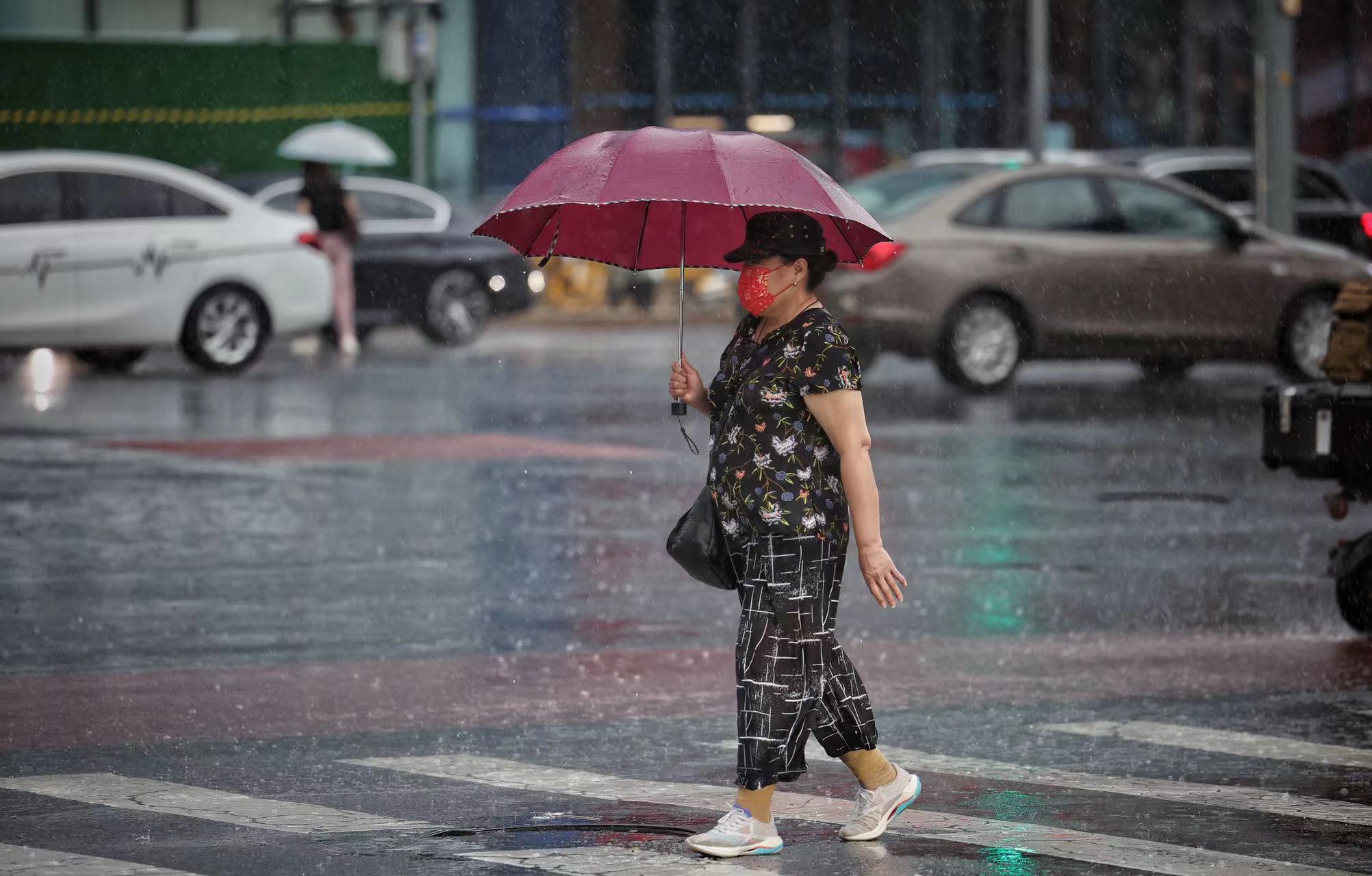 朝阳路,市民冒雨出行。
