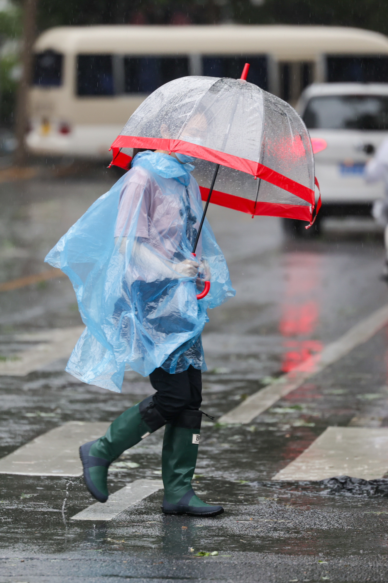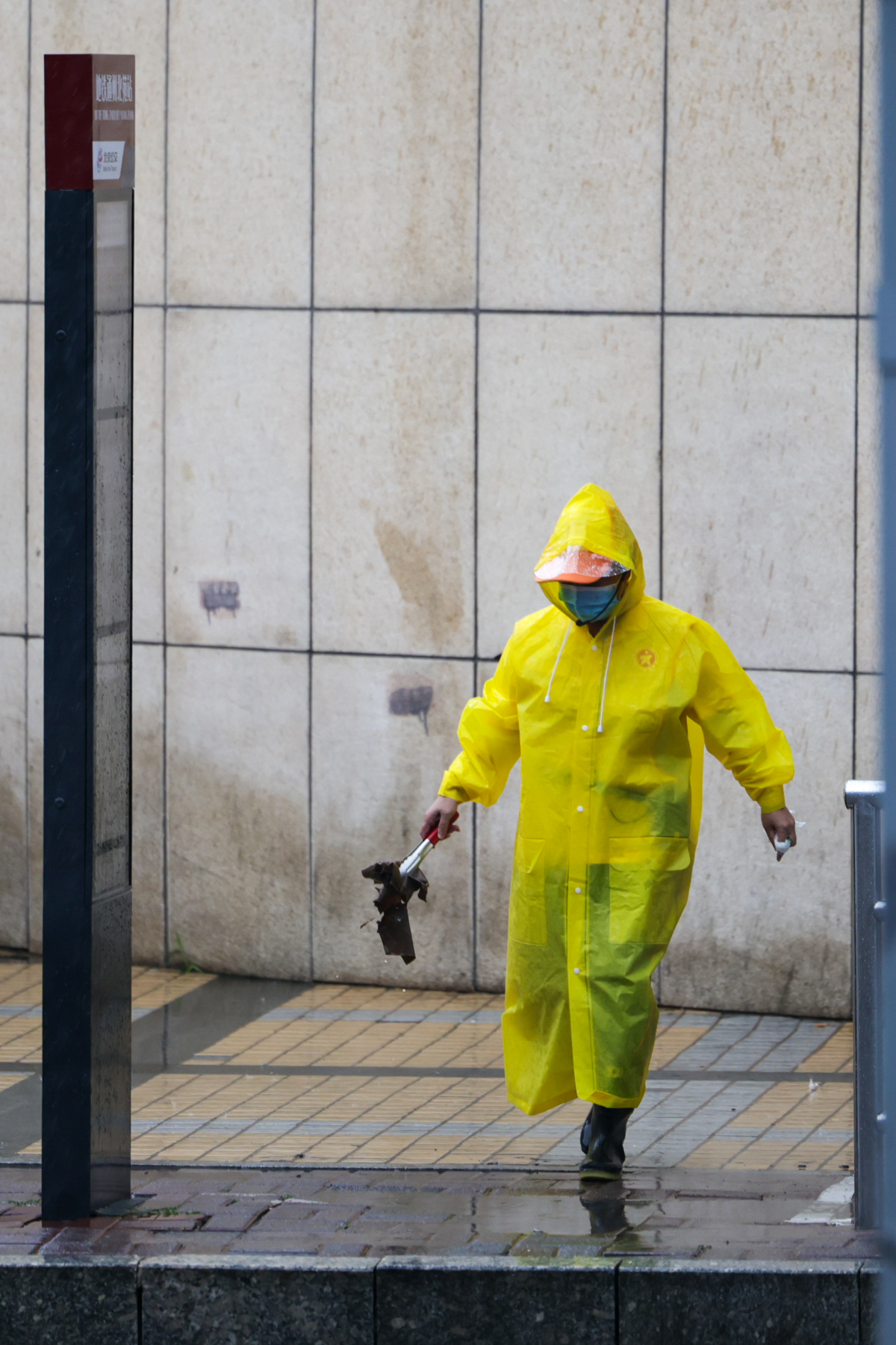 复兴门,全副武装的市民走在雨中。