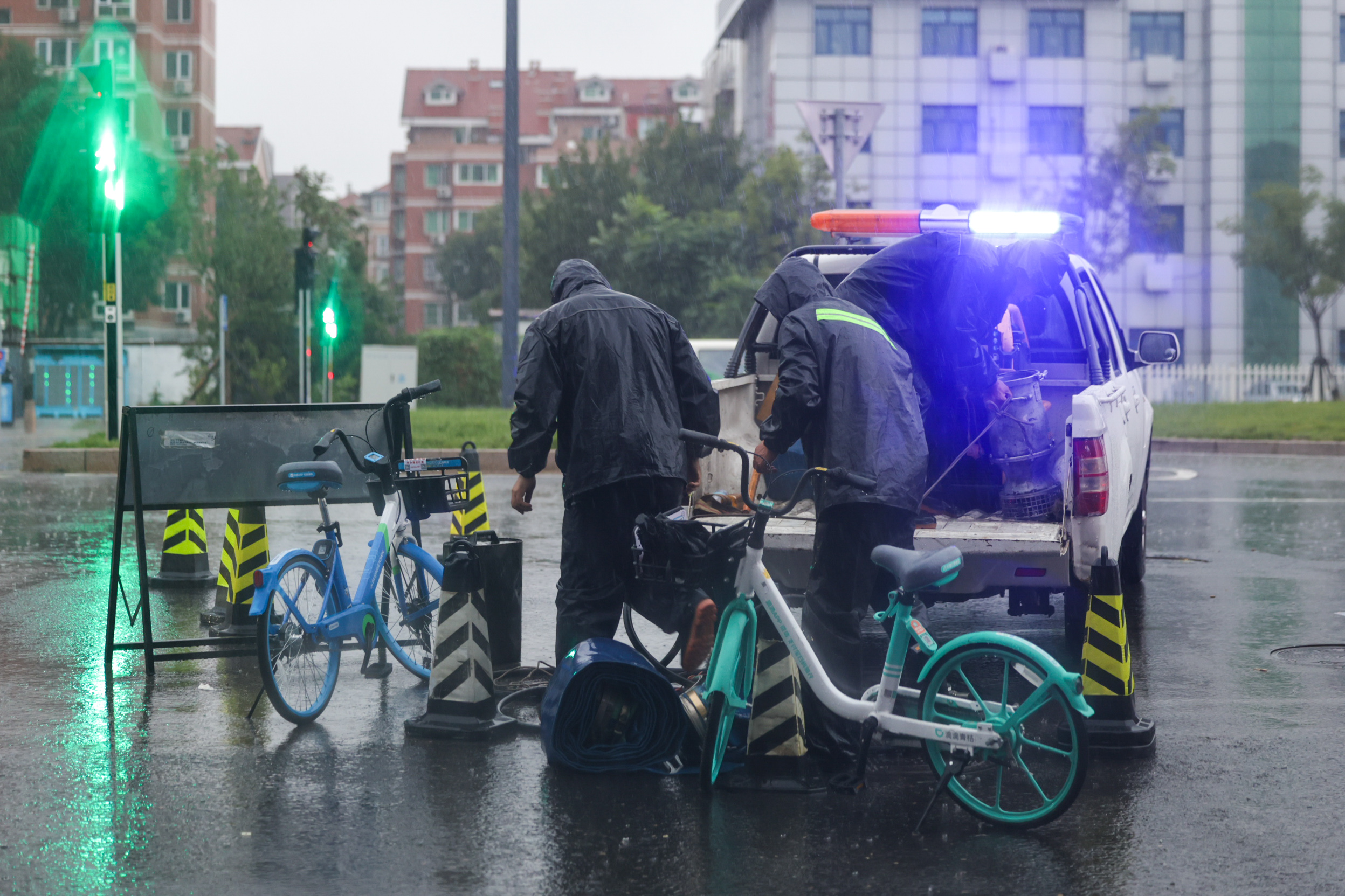 通朝大街,工作人员正在检查排水设备。