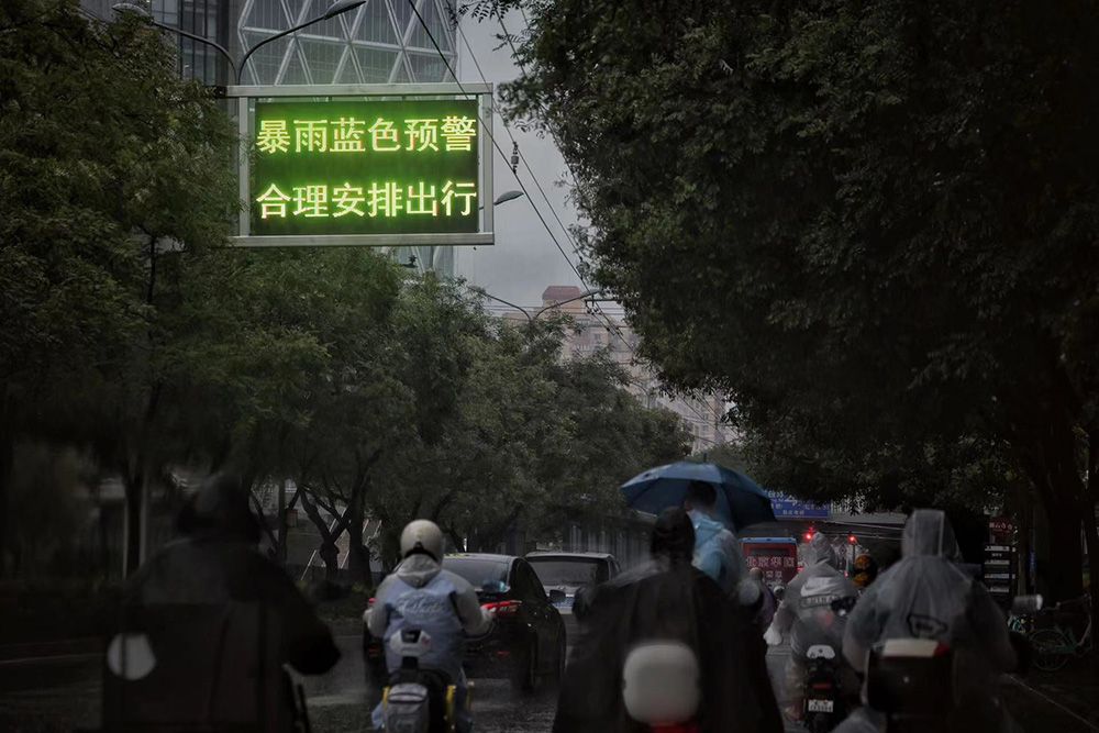朝阳路,电子显示屏上提示“蓝色暴雨预警”。