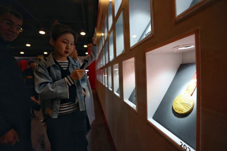 2024北京·马拉松博览会于10月31日起在国家会议中心举行,为期三天。北马参赛选手领取参赛物品的同时,还可参观和体验与马拉松相关的展位,感受马拉松运动的文化和内涵。图为展出的历年北马奖牌。