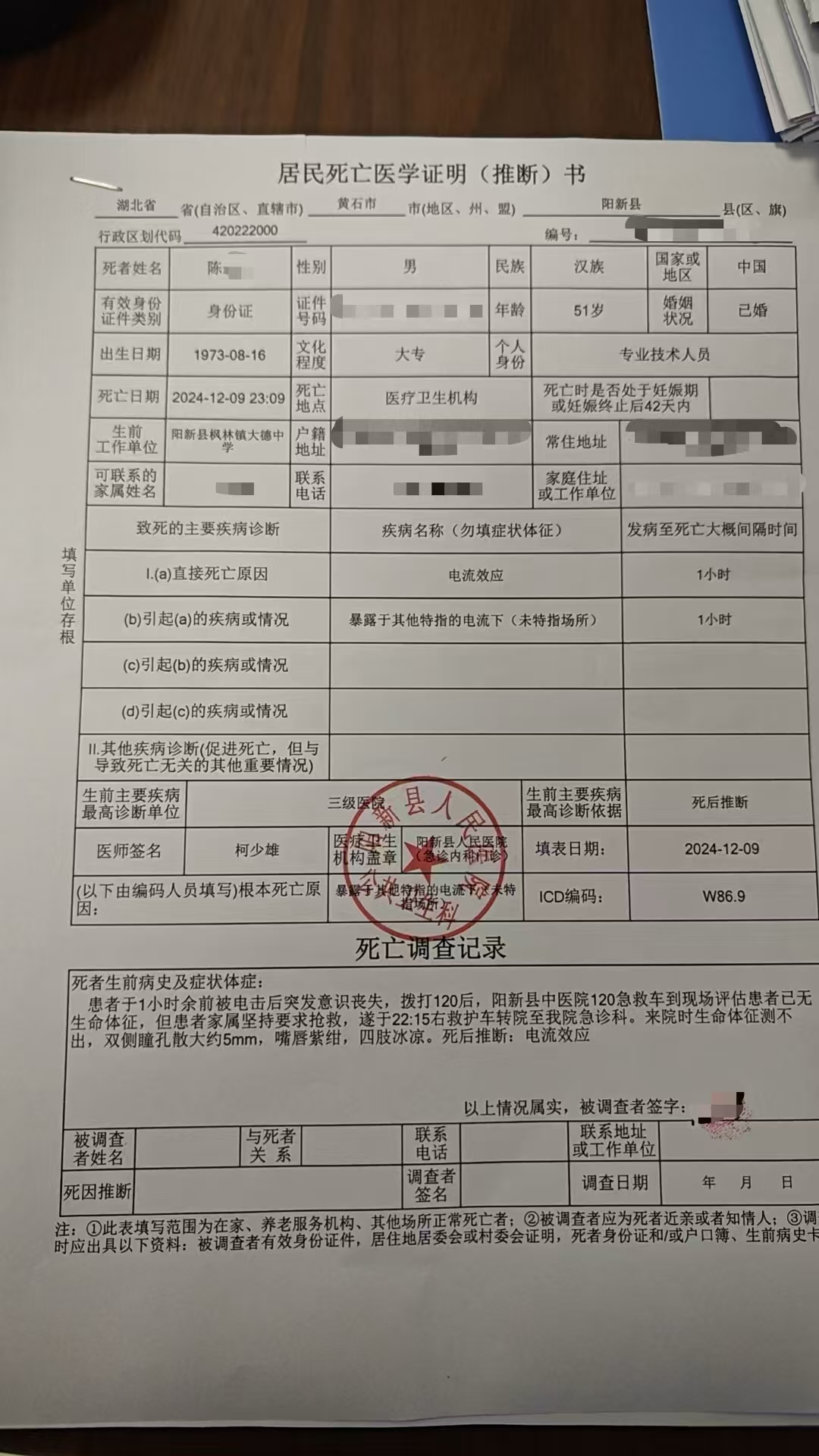 妻子提供的死亡证明显示,陈勇的直接死因为“电流效应”。