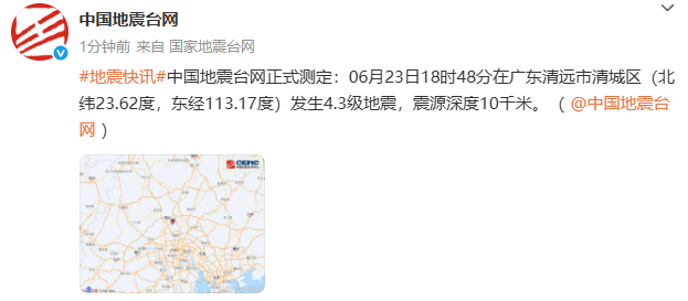 新京报讯 据中国地震台网正式测定:06月23日18时48分在广东清远市清城区(北纬23.62度,东经113.17度)发生4.3级地震,震源深度10千米。