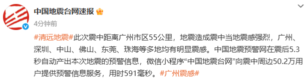 广东清远市清城区发生4.3级地震 震中距离广州市区55公里