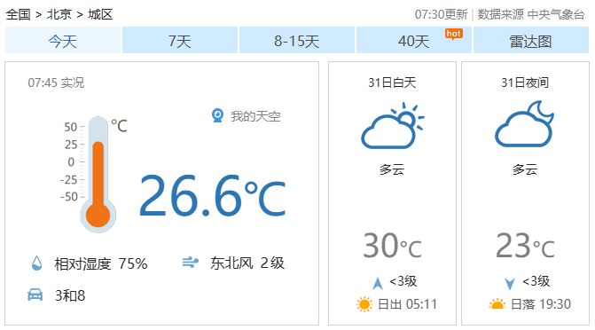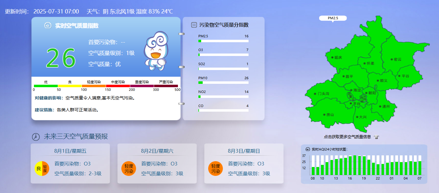 据北京市生态环境监测中心今早7时数据,目前实时空气质量指数26,空气质量优。
