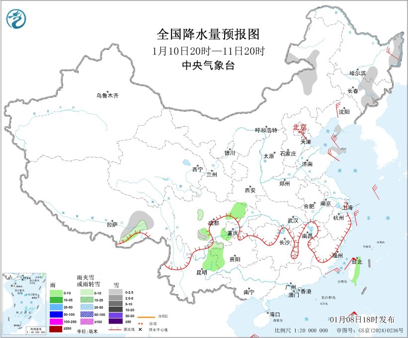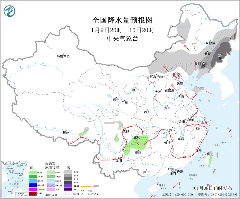 图4 全国降水量预报图(1月9日20时-10日20时)