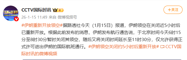 据@CCTV国际时讯消息,据路透社今天(1月15日)报道,伊朗领空在关闭近5小时后已重新开放。根据此前发布的消息,伊朗发布航行通告说,于北京时间今天6时15分至8时30分暂时关闭其领空,随后又将关闭时间延长至11时30分,仅允许获得正式许可进出伊朗的国际航班通行。