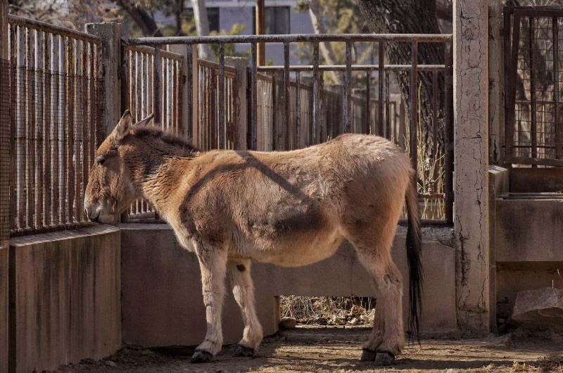 2月4日,北京动物园,亚洲野驴。亚洲野驴也属于马科动物,它们栖息在高原亚寒带开阔草甸和寒冻半荒漠、荒漠地带,善于奔跑,白天大部分时间在水源附近觅食。北京动物园,唯一的一头亚洲野驴是普氏野马的邻居。它们时常隔着栅栏“交流”,偶尔会故意踢门发起 “挑衅”。