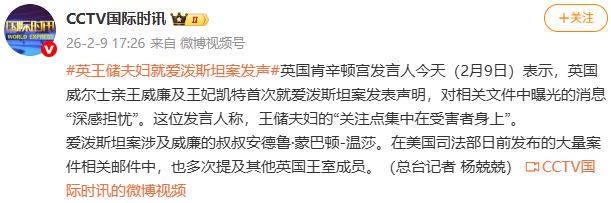 据CCTV国际时讯消息,英国肯辛顿宫发言人今天(2月9日)表示,英国威尔士亲王威廉及王妃凯特首次就爱泼斯坦案发表声明,对相关文件中曝光的消息“深感担忧”。这位发言人称,王储夫妇的“关注点集中在受害者身上”。