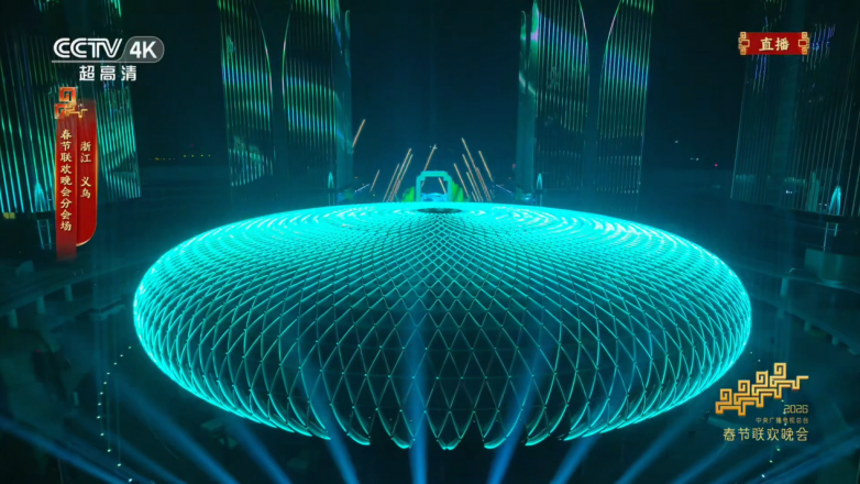 2026年2月16日,中央广播电视总台《2026年春节联欢晚会》如约而至。在歌舞《世界义乌中国年》的热烈氛围中,首次作为春晚分会场主舞台的义乌全球数贸中心惊艳亮相,向全球观众展现了一座传统商贸之城迈向数字未来的新姿态。其中,核心建筑“数贸港”以灵动变幻的光影、流畅柔美的光色,成为整场晚会最具科技感与文化意蕴的“最美C位”。