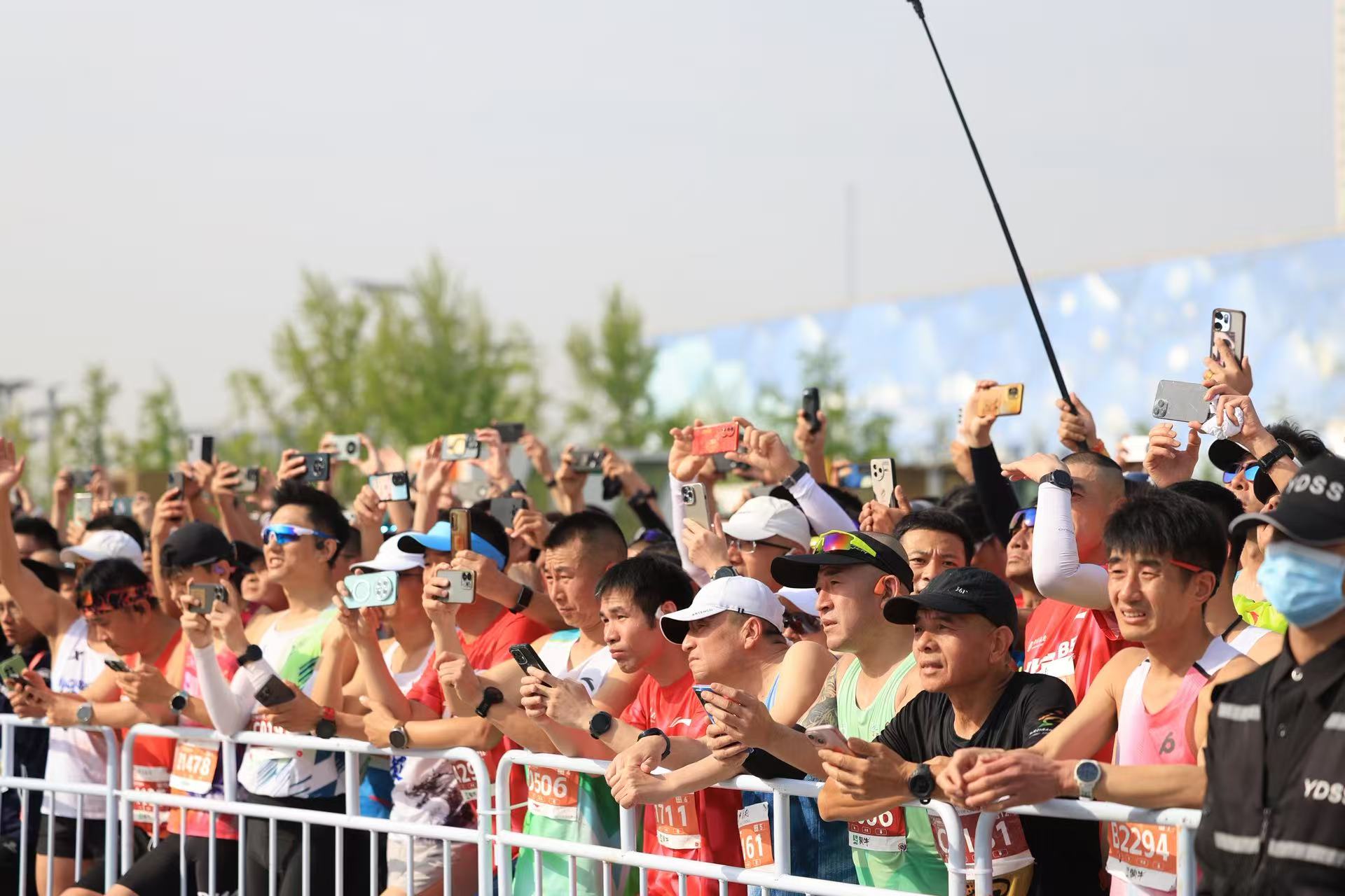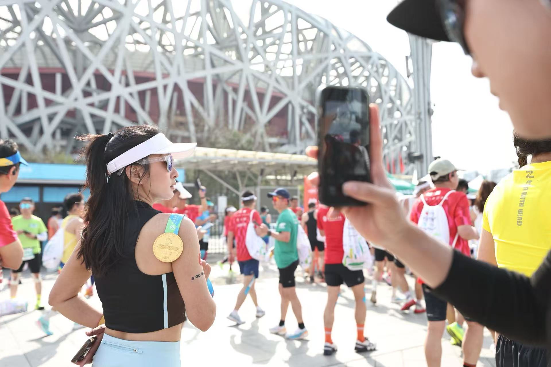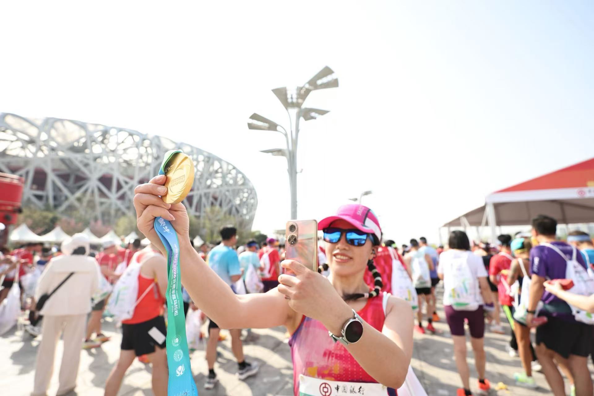 完赛选手拿着奖牌在鸟巢前拍照留念。