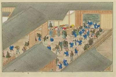 中国客商抵达长崎后,在日本通事的监督下搬运货物的图景,这些通事不仅负责对外翻译,也承担搜集中国情报的谍报工作。