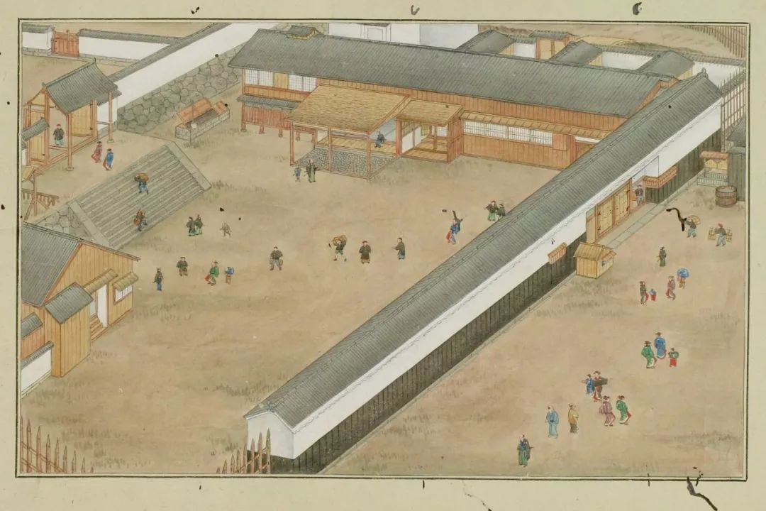 长崎唐馆的情景,城墙和削尖的竹栅栏将中国商人与日本人隔绝开来。