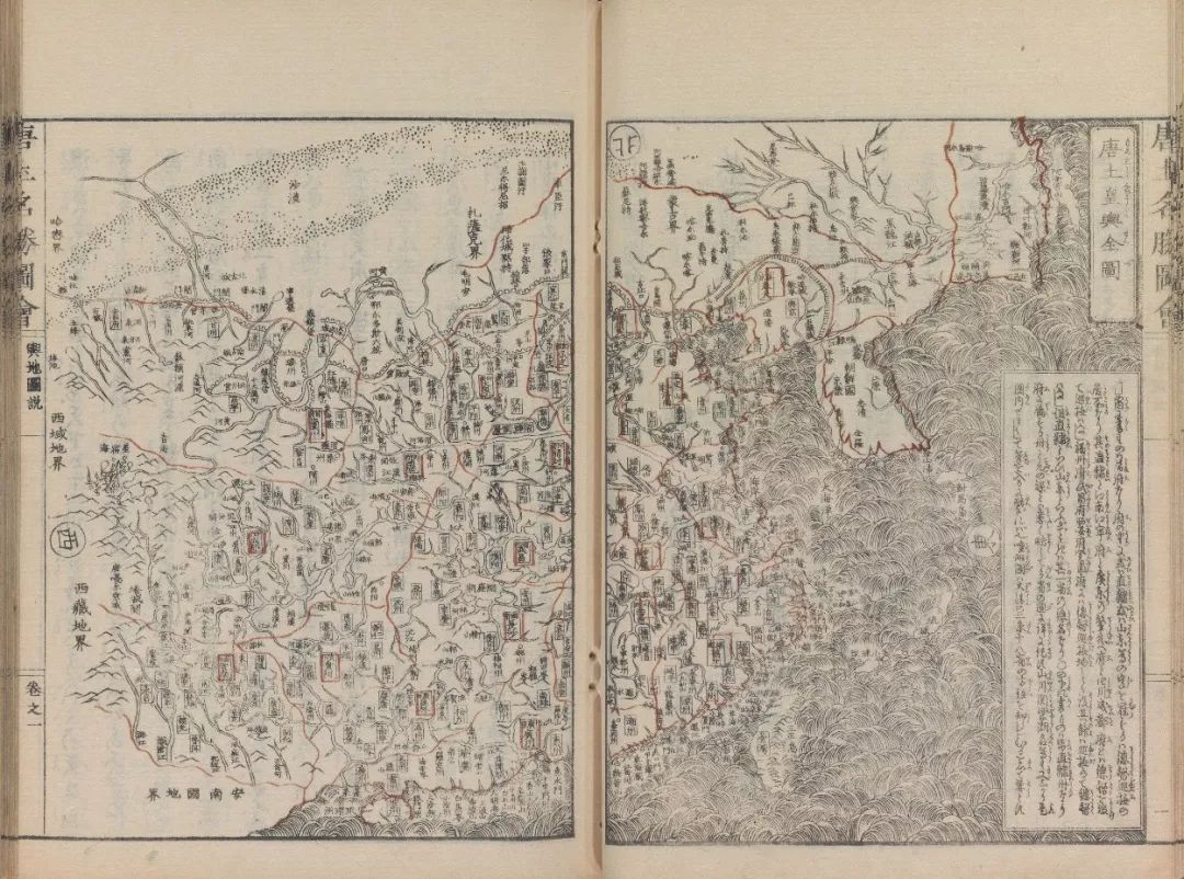 日本冈田玉山等编绘的《唐土名胜图会》中清国舆图,上面细致地标注了各省省会与重要城市、河流与港口。