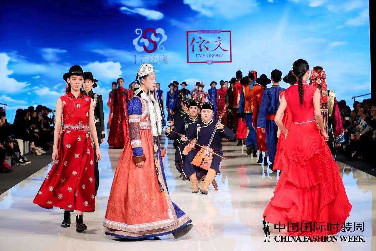 EVE CINA“草原绣梦•巾帼匠心”大秀现场,游牧民族古朴悠扬乐器演奏与华丽霓裳相遇,创造出奇妙的时空感。 图片来源/ 中国国际时装周组委会