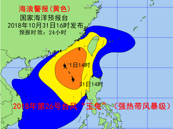 新京报快讯(记者 邓琦)今年第26号台风“玉兔”(强热带风暴级)目前正位于我国南海东部海面上,逐渐向广东沿海方向靠近,国家海洋预报台今天(31日)下午继续发布海浪黄色警报,并发布风暴潮消息。