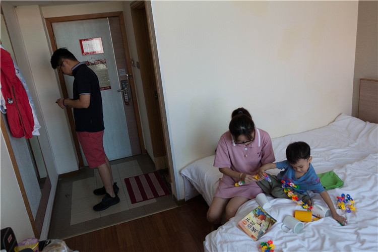 △ 2018年8月31日,首都儿科研究所附近一快捷酒店内,翁勇一家。夫妻俩请假带孩子从福建来北京看病,每次花销至少在三万以上。