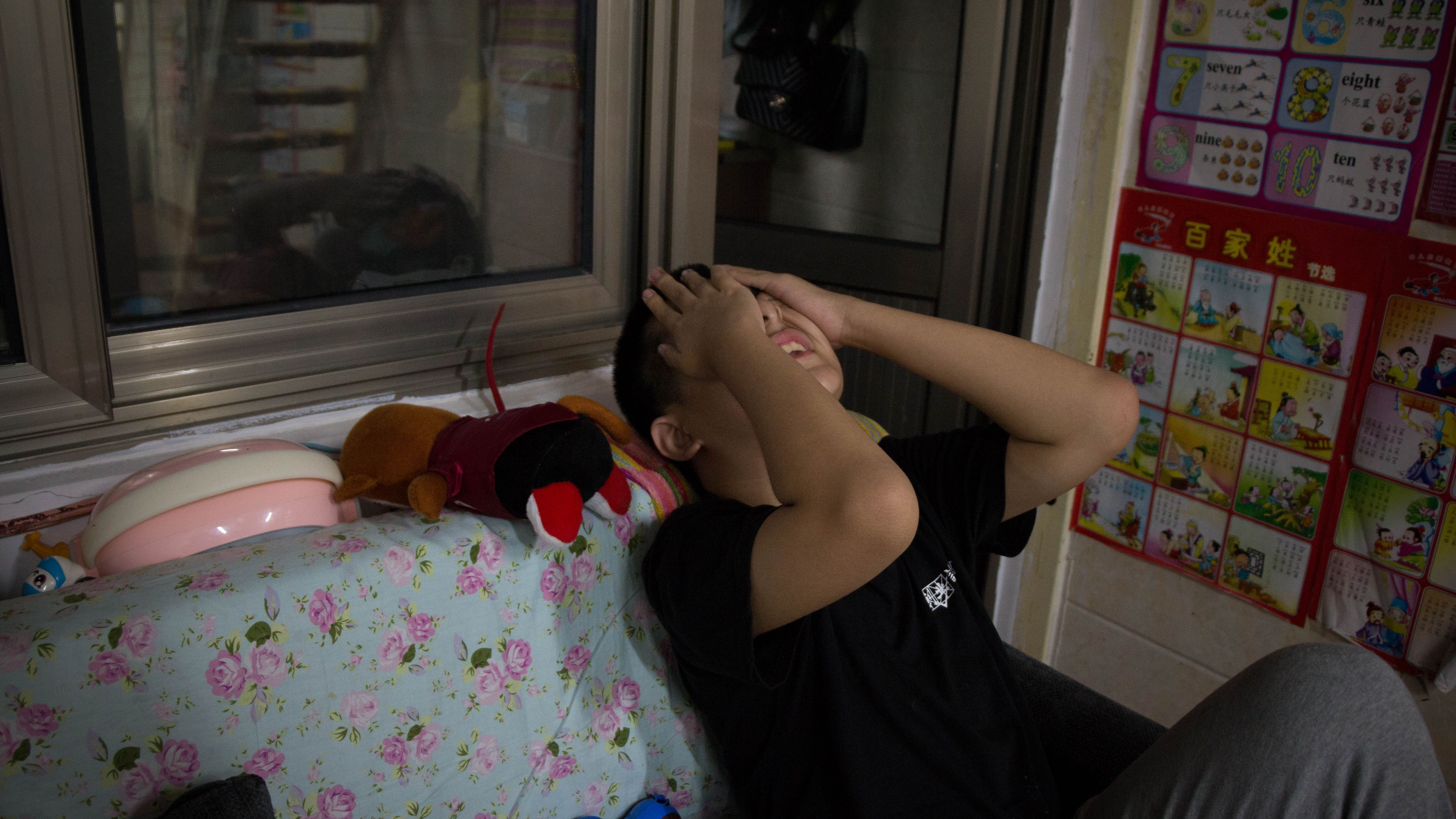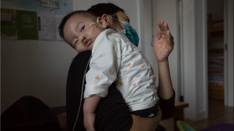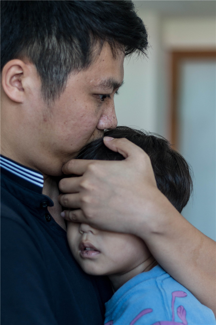 △ 2018年10月13日,北京市海淀区,齐齐侧着脑袋趴在妈妈肩膀上咳红了眼眶,妈妈熟稔地帮他拍背顺气。