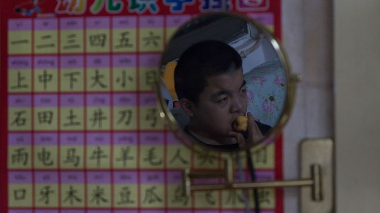 △ 2018年8月28日,北京市昌平区,苏佳宇在等待上菜过程中按揉鼻梁与眼睛。该病一大症状是眼部异常,部分存在晶体脱落状况。17岁时他因经常性睡眠呼吸骤停前去就医,后确诊为马凡综合征——一种发病率约 为1/3000~1/5000的罕见病。