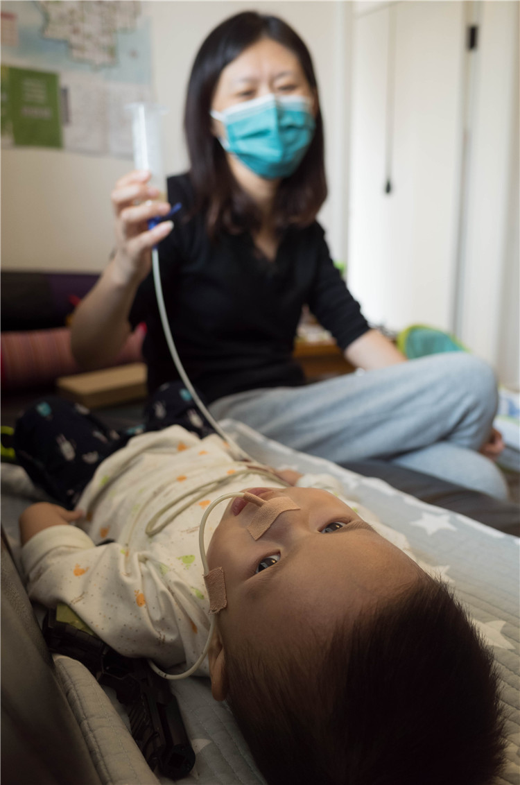 △ 2018年10月13日,北京市海淀区,齐齐妈妈将冲好的奶粉灌到针筒里。因为咀嚼困难,容易呛到,齐齐大部分进食都是依靠鼻饲。他每次喝药和喝奶都是通过针筒打到胃里。在国外不同人种之间,糖原累积病Ⅰ型总发病率约为1/100000 ~ 1/200000,Ⅰa型占80%;糖原累积病Ⅱ型发病率约 1/100000 ~ 1/14000,中国台湾约 1/50000。国内无准确的流行病学依据。
